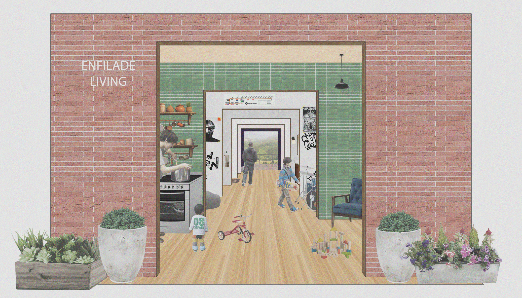 Enfilade Living is a modular, affordable housing system that removes traditional hallways to maximize usable space. Units are organized around a continuous open path, with private rooms tucked to the side and dual exterior access offering both communal and individual entries. A cruciform structural system defines the spaces in all three dimensions, allowing units to scale from compact studios to two-bedroom apartments. The system is deployed on a site with a historic NOPSI substation, integrating residential and public spaces through adaptive reuse. This project explores how structure can drive spatial logic, density, and affordability in both new and existing urban contexts.
